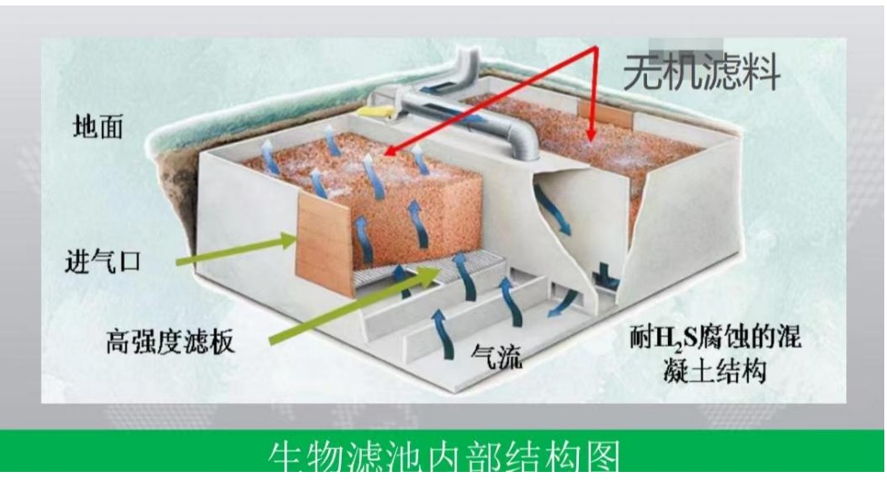 臭氣化合物,主要是硫化氫和有機氣體,向上流動穿過生物濾池內的濾料,生物濾料為經優化加工的無機濾料,將惡臭污染物徹底降解為H20和C02,實現總臭氣濃度控制。