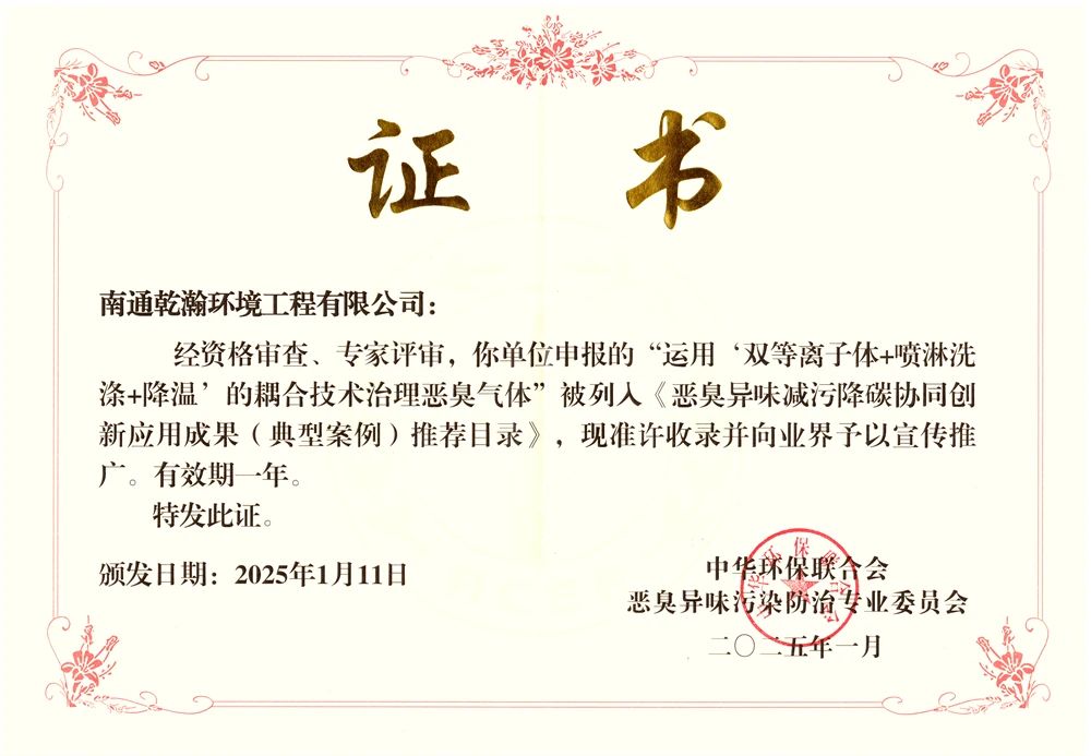 【科技賦能 助力環保】南通乾瀚在中華環保聯合會惡臭異味污染防治專業委員會成立大會上,獲得中華環保聯合會典型案例推薦目錄證書